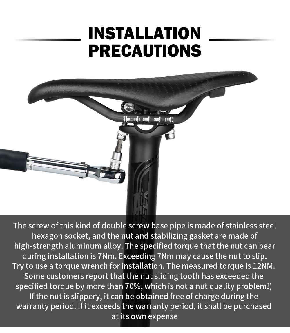 Torque Spec:Seatpost Collar Determined by your Frame manufacture/Seatpost Collar(Recommended locking torque ≤ 5Nm)
