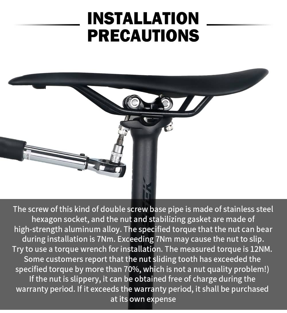 Torque Spec:Seatpost Collar Determined by your Frame manufacture/Seatpost Collar(Recommended locking torque ≤ 5Nm)